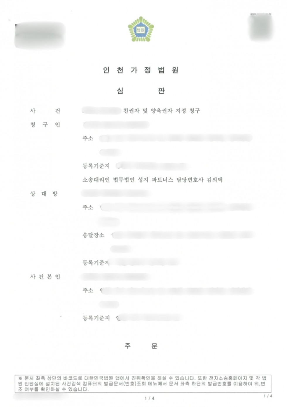 이에 본 대리인은 상대방의 수감 상태가 자녀의 양육 환경에 미치는 영향을 강조하는 추가 서면과 함께 자녀의 복리를 위한 최선의 양육 환경이 의뢰인에게 있다는 점을 입증하는 증거 및 전문가 의견을 제출하였습니다. 또한 향후 자녀의 양육비 확보를 위하여 양육비 청구도 진행하였습니다.