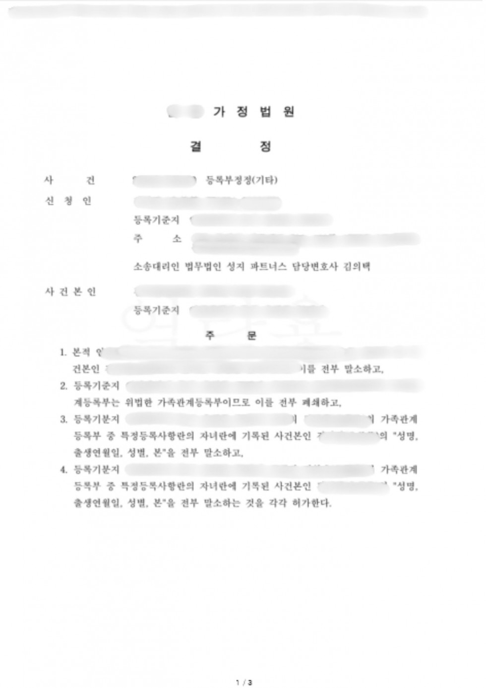 이후 오랜 시간이 흐르고 A가 사망하였고, 가족 간 상속 문제가 발생하였습니다. 이에 의뢰인은 잘못된 가족관계등록부를 바로잡고 ,상속 문제를 해결하기 위해 법무법인 성지파트너스에 가족관계등록부 정정 소송을 의뢰하였습니다.