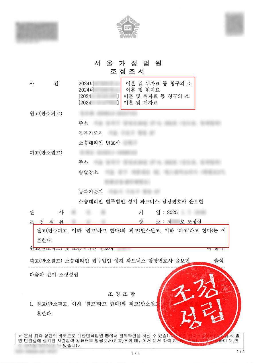 본 대리인은 의리인과 심층 면담을 하고, 결혼 생활 전반과 부부 싸움 당일 상황을 상세히 기록한 경위서를 검토했습니다. 자녀들과 배우자 간의 대화 내용을 분석한 결과, 폭행 사건에 대한 배우자의 진술이 사실과 다르다는 점이 확인되었습니다. 이에 본 대리인은 반소를 제기했습니다. 반소 내용에는 의뢰인 역시 원고로부터 폭행과 욕설 등 부당한 대우를 받았다는 점, 원고가 막내 아들의 희귀질환 발병 원인이 불분명함에도 의뢰인에게 책임을 전가해 분쟁을 야기했다는 점을 포함했습니다. 재판으로 나아가기 이전 조정 절차에서는 자녀들이 부부 싸움의 전말을 알고 있어, 일방적 폭행 혐의에 대한 사실이 밝혀져 선고에 영향을 미칠 것이라며 조정 이혼으로 나아가도록 상대방을 설득했습니다. 그리고 의뢰인에게 가장 유리한 방향으로 합의 내용을 조율했습니다.