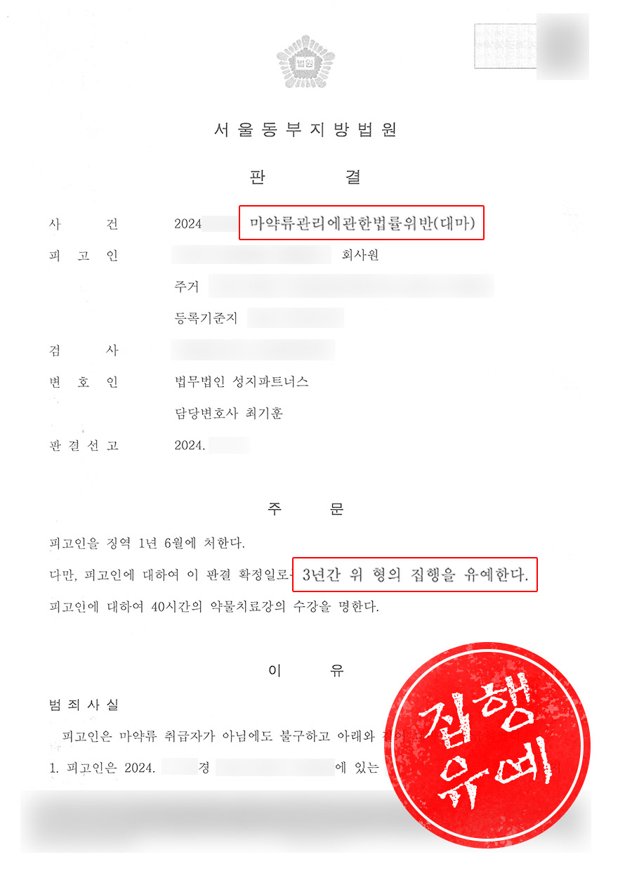 의뢰인이 대마 관련 음식을 섭취하고 수수 행위를 한 정황이 확실했으므로 변호인은 혐의를 인정하고 선처를 받는 방향으로 조력하고자 했습니다. 재판부에 의뢰인이 진심으로 반성하고 있다는 점이 받아 들여지도록 대마 함유 젤리를 받은 다른 피고인에게도 자수를 권한 사실 등의 양형 요인을 밝혀 선처를 호소했습니다.