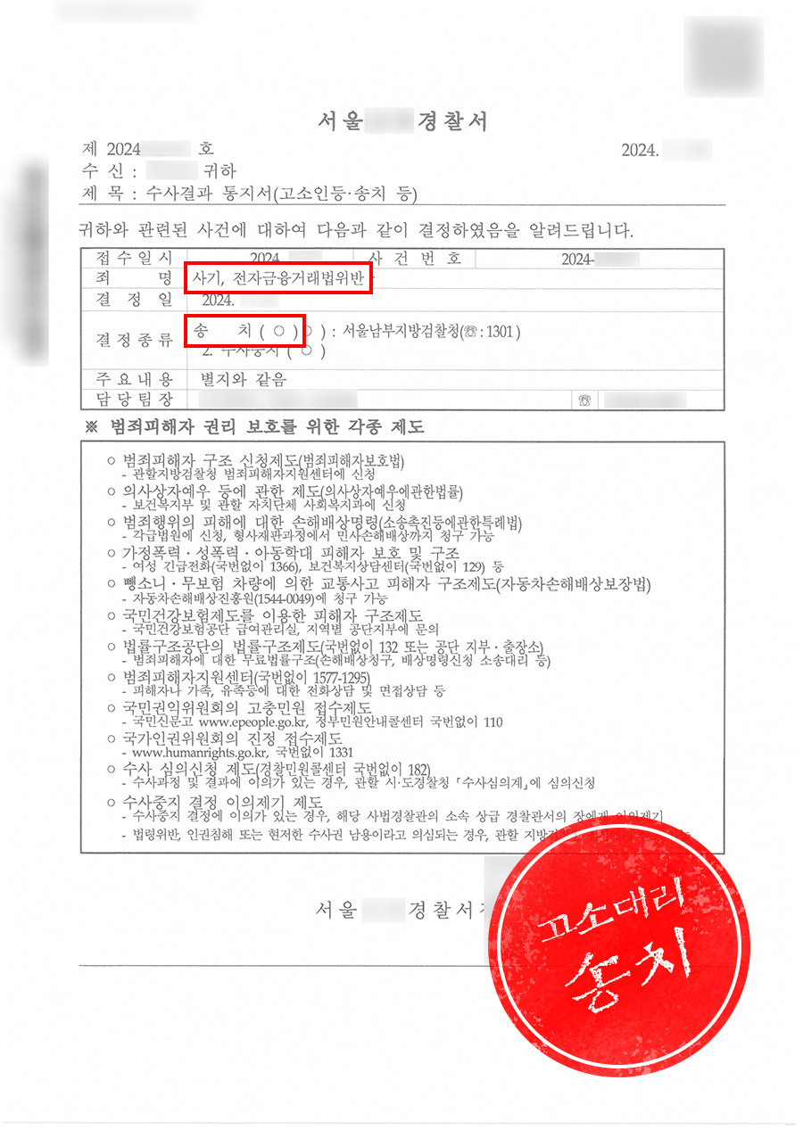 담당 경찰서는 본 사건을 사기 혐의와 전자금융거래법 위반으로 송치 결정하였습니다.