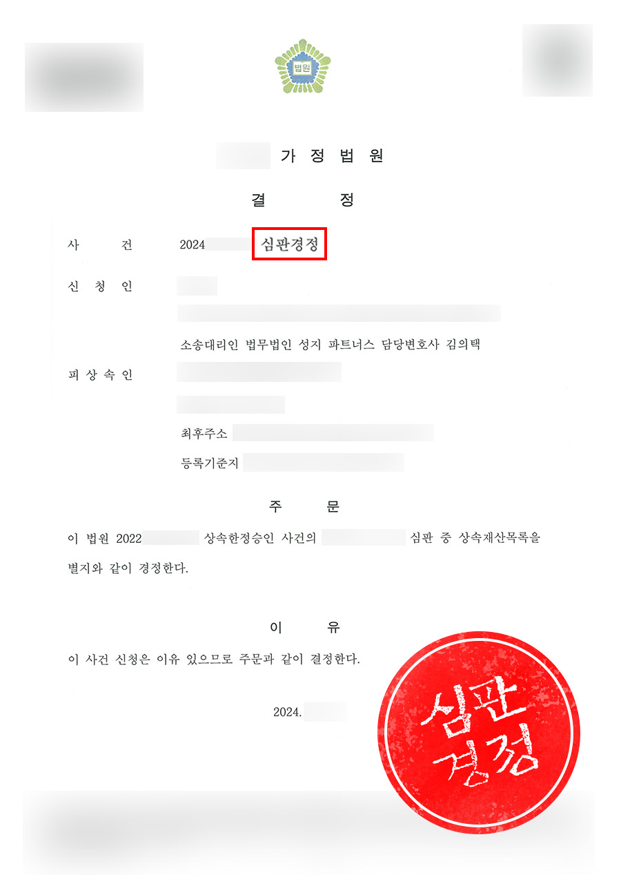 법원은 본 대리인의 신청이 이유가 있으므로 상속재산목록을 경정하는 것으로 결정하였습니다.