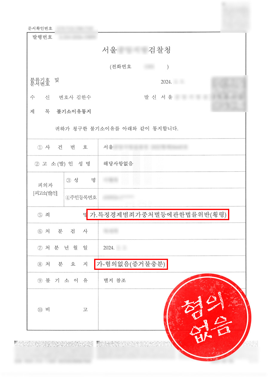 검찰은 변론에 나타난 사정에 따르면 증거가 불충분하여 혐의가 없다고 처분하였습니다.