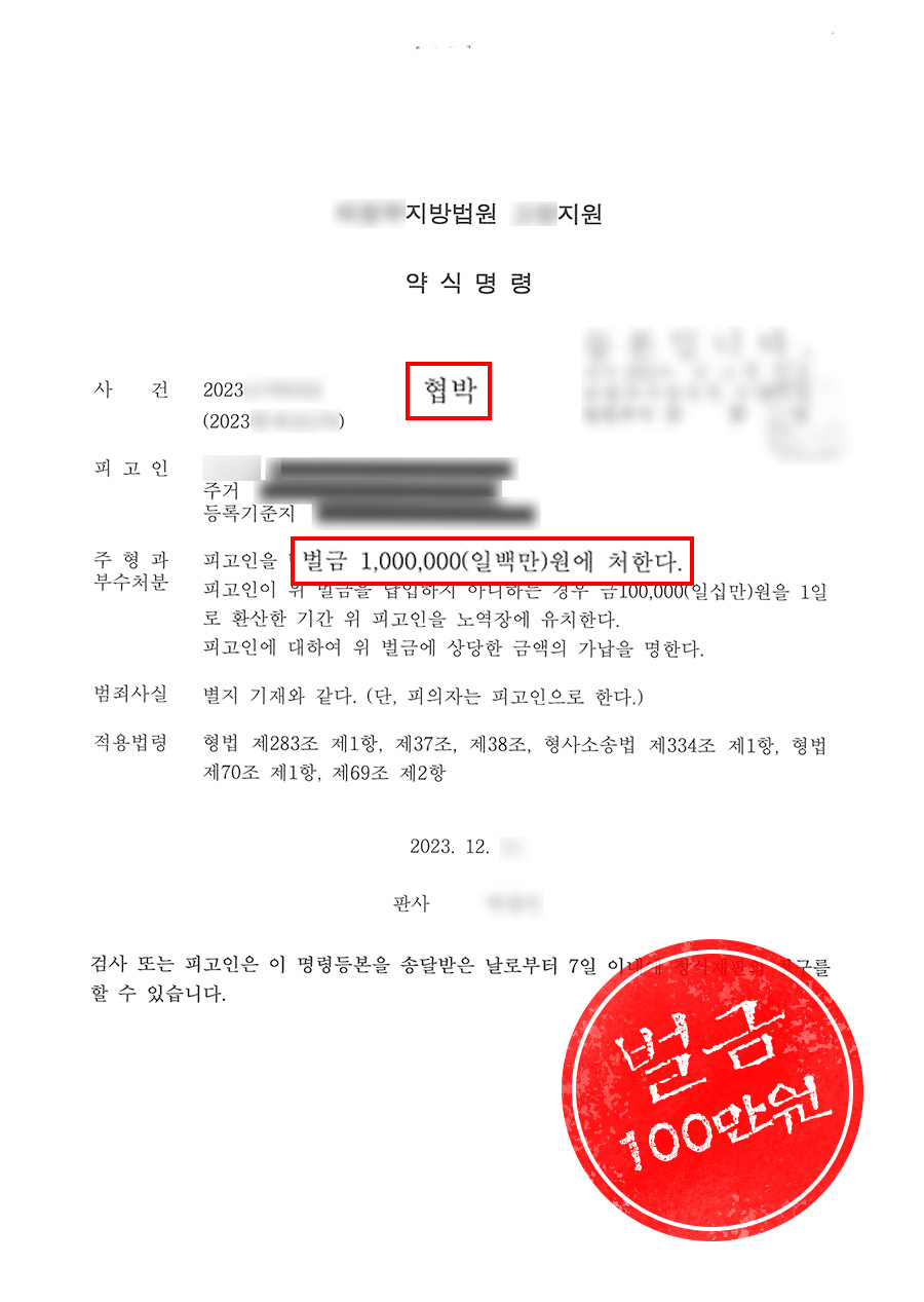 검찰은 피의자가 피해자에 신상을 해악을 가할 듯한 태도를 보였음을 인정하여 벌금 1백만 원에 해당하는 약식기소 결정을 내렸습니다.