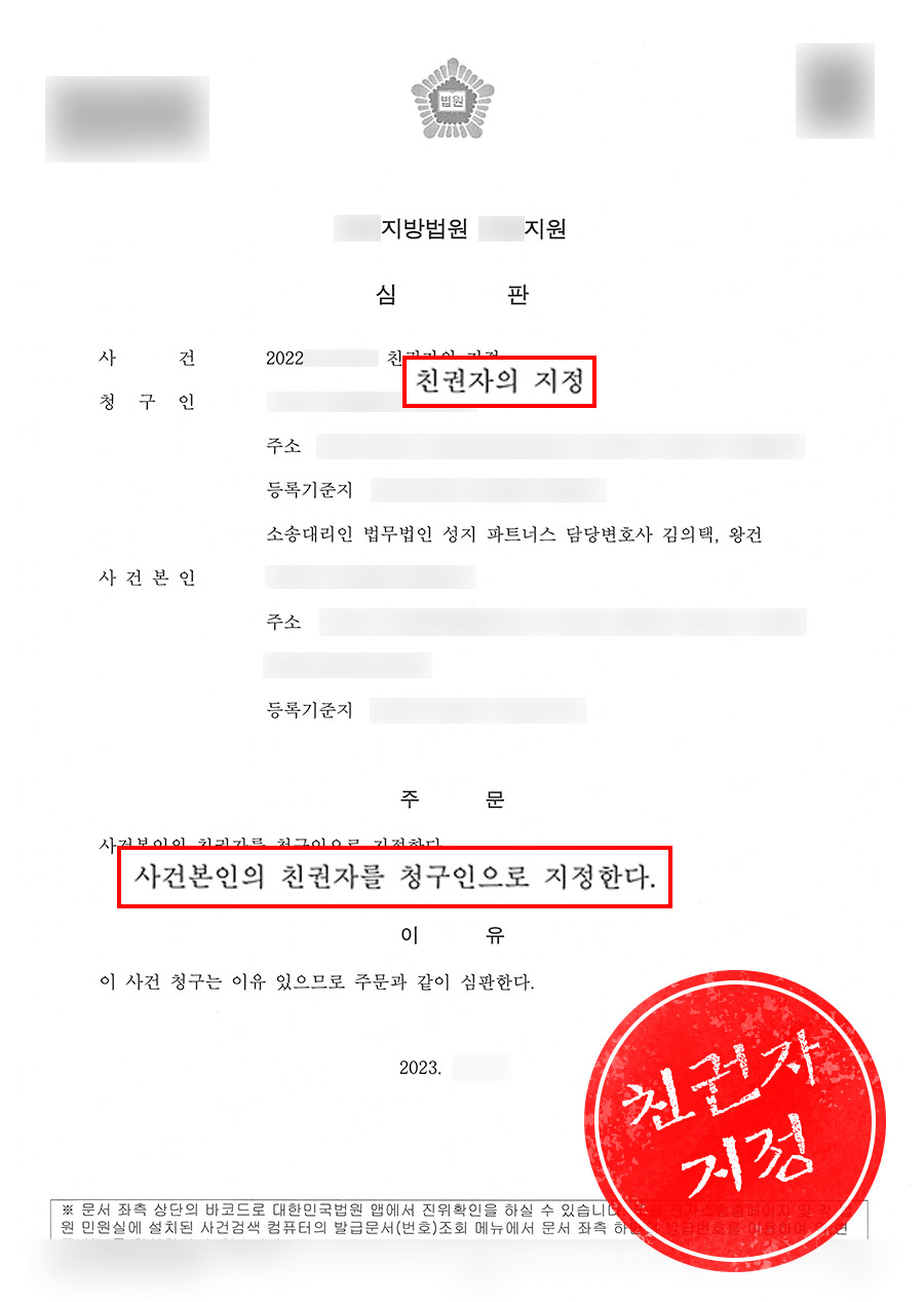 법률 대리인이 조력하여 상호간 합의를 이끌어 낸 결과 의뢰인이 자녀의 법정대리인으로 지정되었습니다.