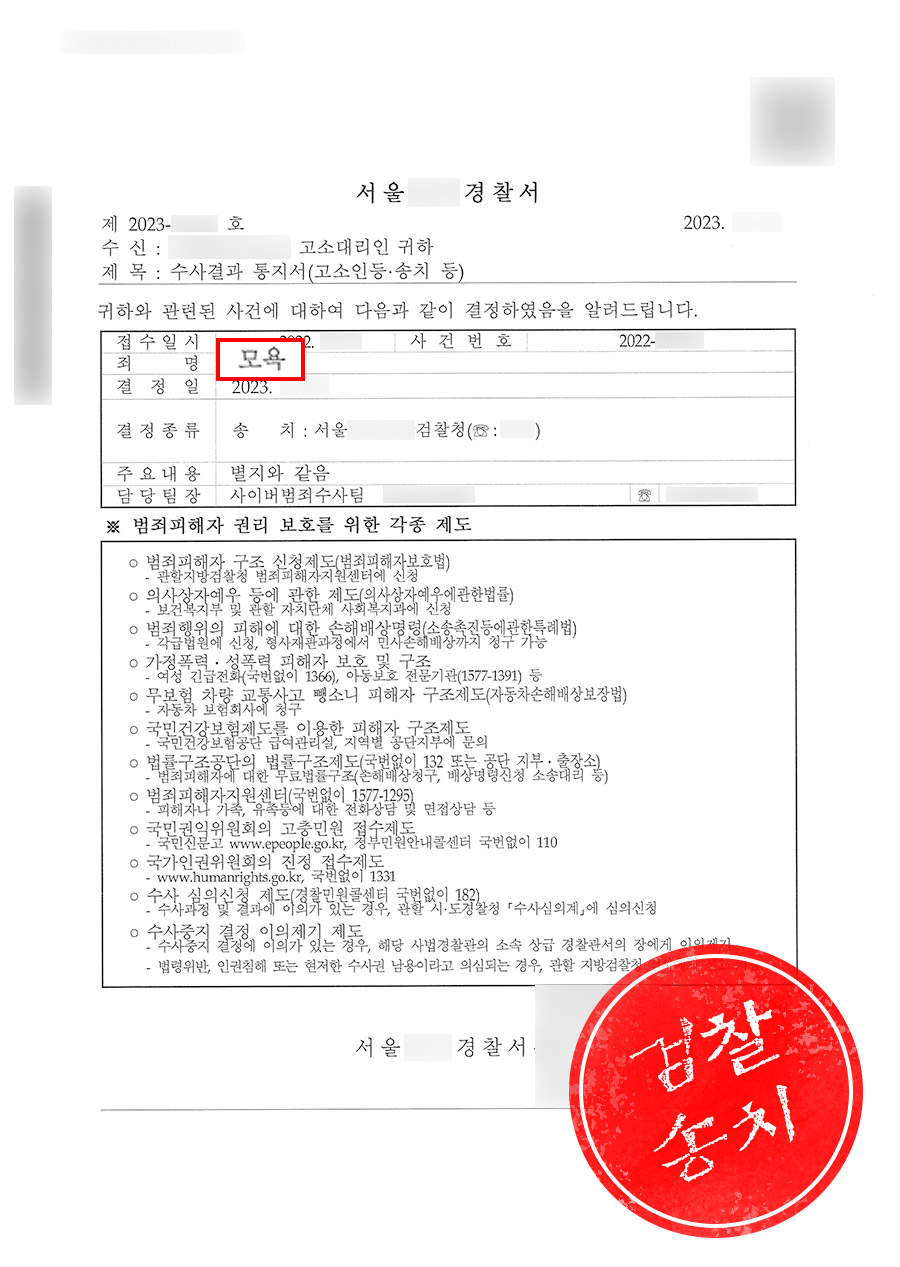 인터넷 상에서 발생한 모욕죄는 피해자가 특정되지 않는다는 등의 이유로 불송치 결정되는 경우가 많습니다. 본 사건의 피고인은 불송치 결정을 나오게 하기 위하여 일찍이 변호인을 선임한 상태였습니다.