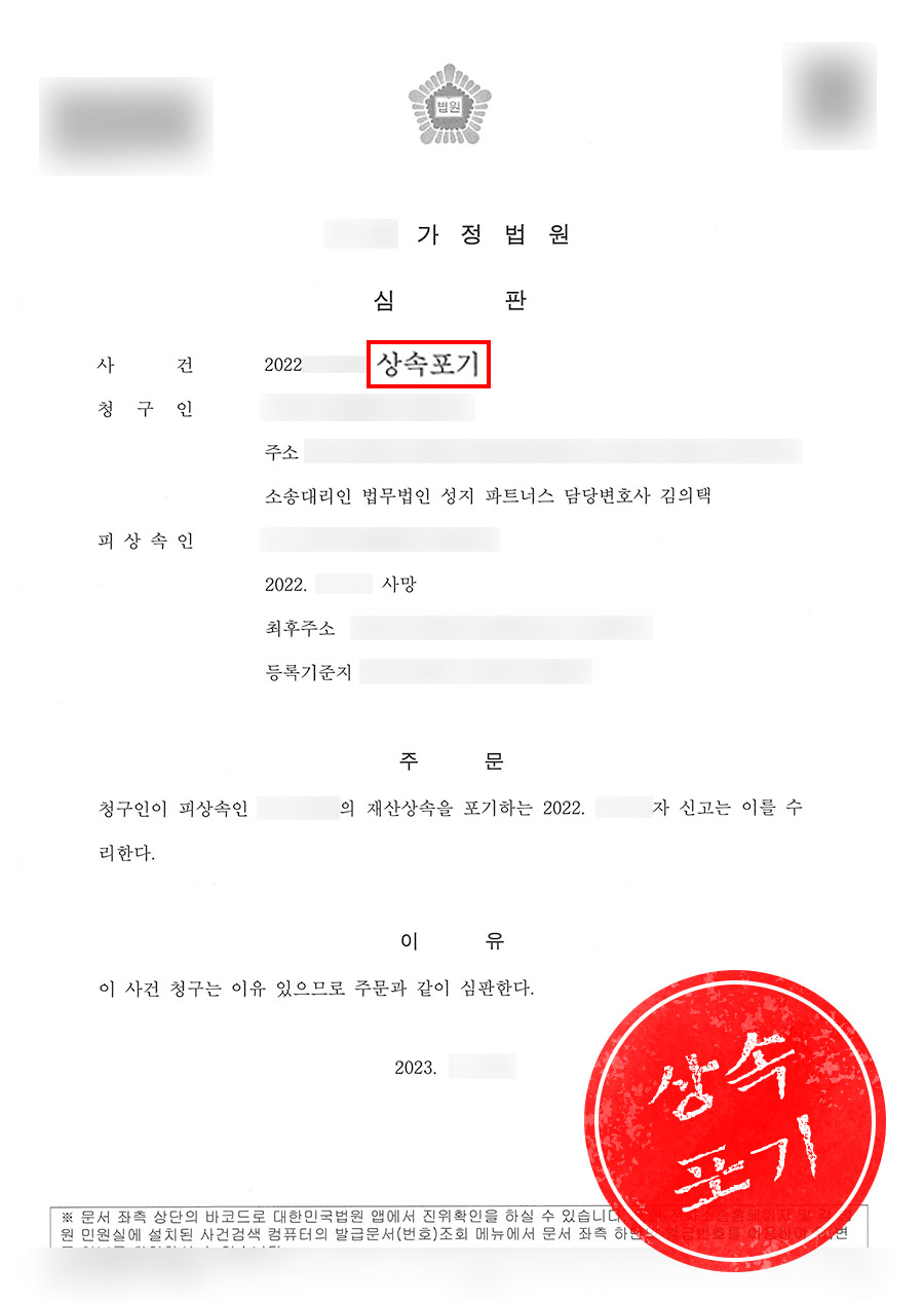 의뢰인으로부터 위임을 받은 담당 변호사가 피상속인의 재산 및 채무 상태를 검토하였고 재산목록을 작성하였습니다. 금전대차약정도 제대로 하지 않은 채권자들이 의뢰인에게 채무를 갚을 것을 요구하였습니다. 하지만 대리인이 법적으로 대응하였습니다. 재산목록을 작성한 결과 재산 총액보다 채무액이 더 많아 법원에 상속포기 신청서를 제출하였습니다.