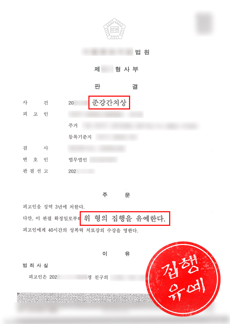 본 혐의는 죄질이 좋지 않은 성범죄에 해당하므로 피해자의 용서가 가장 중요하다고 판단되었습니다. 의뢰인의 행위로 인하여 피해자는 상해에 이르기까지 하여 합의가 어려울 것으로 예상되었으나 담당 변호인이 대리하여 의뢰인의 사죄를 전하고 합의를 조율하였습니다. 피해자는 의뢰인도 취한 상태였다는 점을 이해하여 처벌 불원을 밝혔습니다. 이후 변호인은 재판부에 사건 발생 경위를 밝히며 선처를 호소하였습니다.