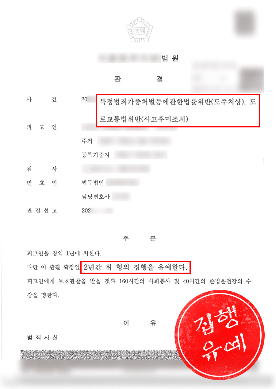 재판부는 음주운전을 숨기려고 도주한 점에서 죄질이 매우 나빠 징역 1년에 처하나 변론에 나타난 양형을 고려하여 2년간의 집행유예를 선고하였습니다. 또한 보호관찰과 160시간의 사회봉사 및 40시간의 준법운전강의 수강을 명령하였습니다.