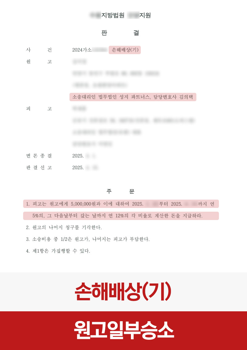 법원은 피고에게 원고가 청구한 일부 손해배상금 5,000,000원과 이에 대한 연 5% 및 그 다음날부터 연 12%의 지연이자를 지급하도록 판결하였습니다.