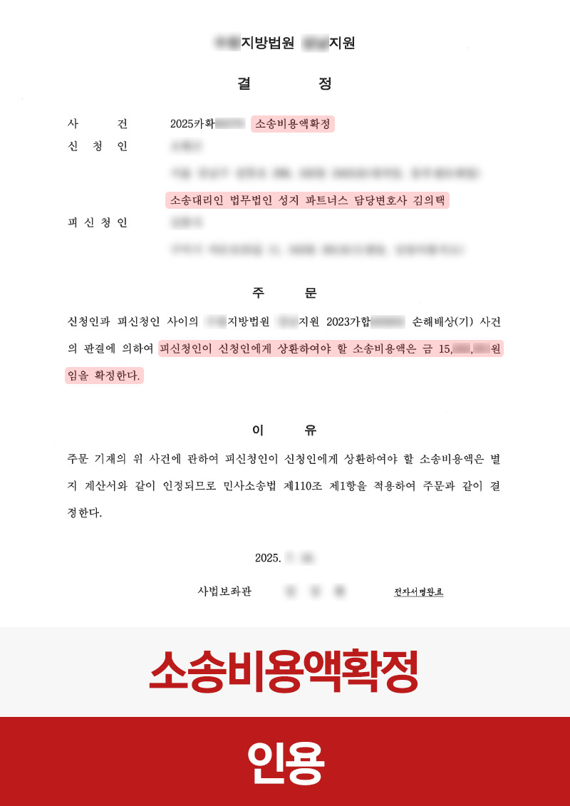 법원은 의뢰인이 신청한 소송비용을 모두 인정하여 소송비용 전액 확정 결정을 내렸습니다. 이를 통해 의뢰인은 승소 판결뿐 아니라 소송 과정에서 발생한 모든 비용을 법적으로 회수할 수 있게 되었습니다.