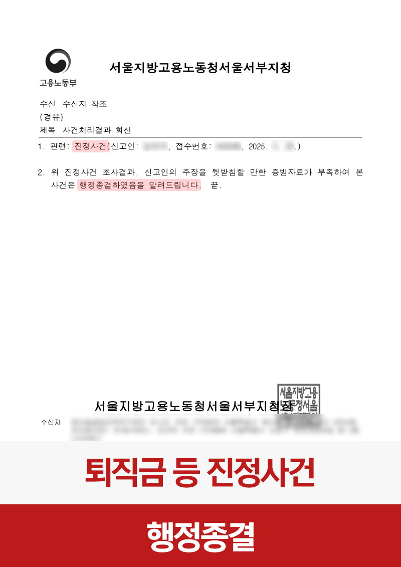 노동청은 진정인의 주장을 뒷받침할 증빙자료가 부족하고, 계약 및 근무 형태상 근로자로 보기 어렵다고 판단했습니다. 이에 따라 본 사건은 추가 조치 없이 행정종결 처리되었습니다.