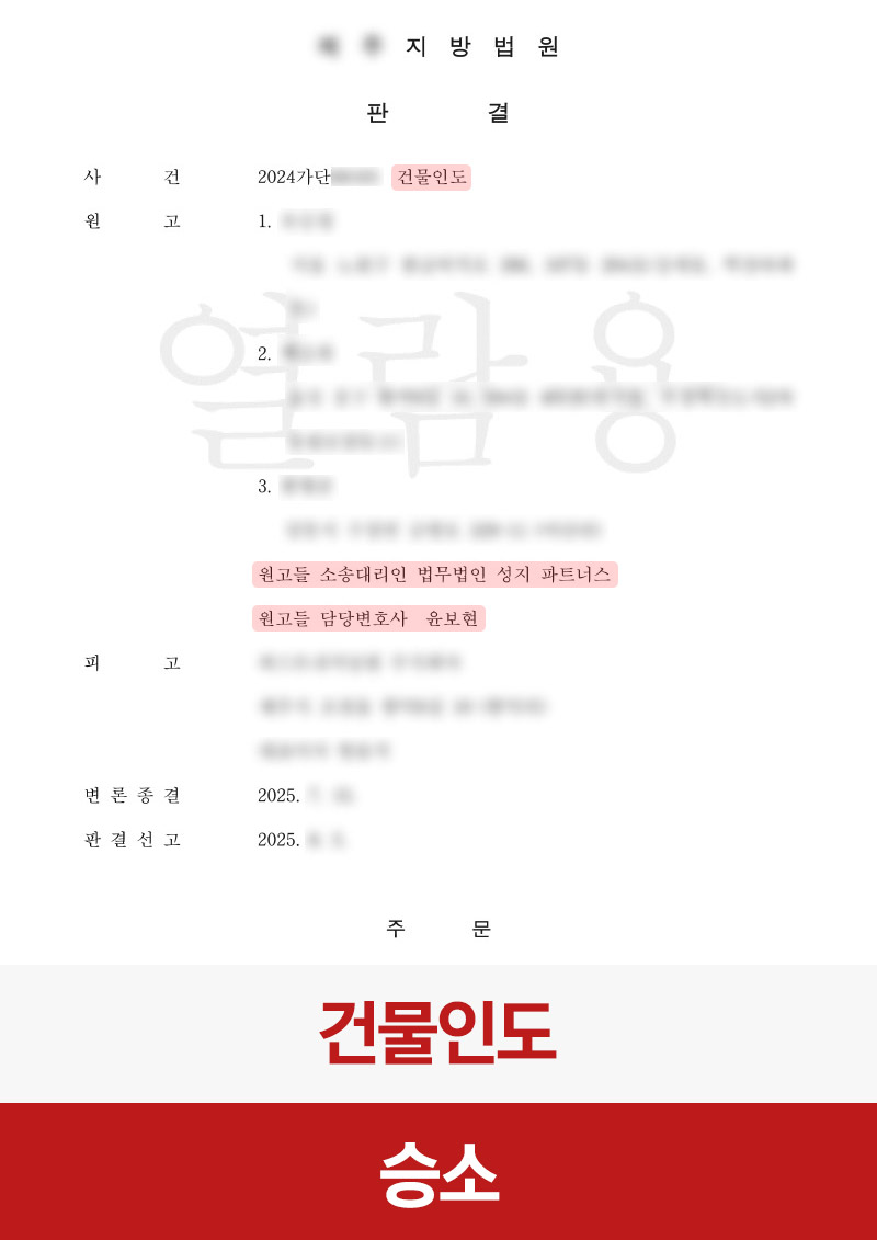 그 결과, 의뢰인은 건물인도, 원상회복, 손해배상, 부당이득반환 청구 전부에 대해 승소하는 결과를 얻을 수 있었습니다.