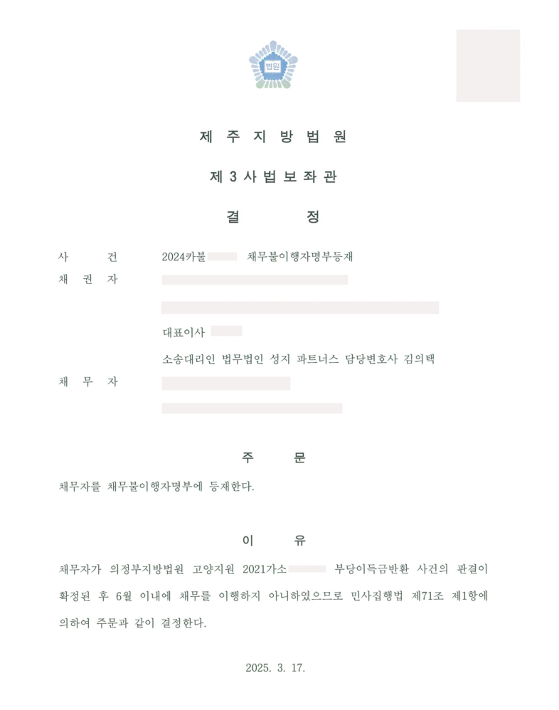 [채무불이행등록] 승소하였음에도 6개월이 지나도록 채무를 변제하지 않아 채무불이행 등록