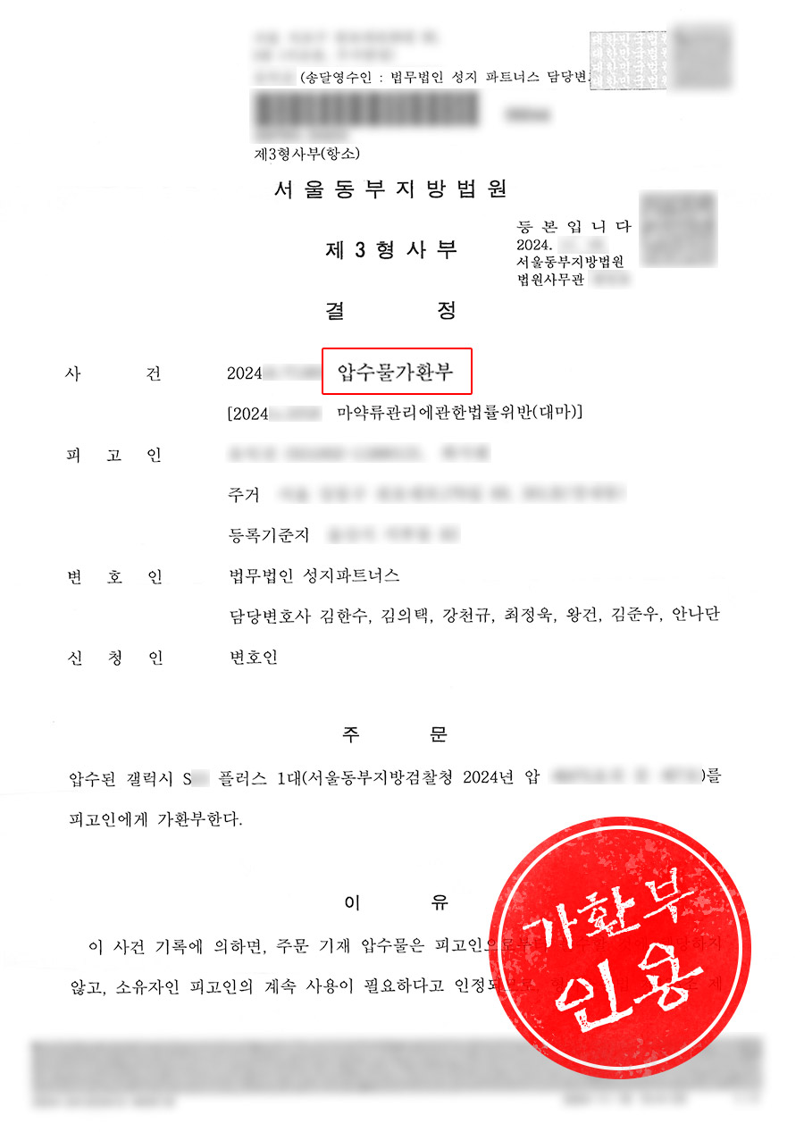 담당 변호인은 형사소송법 제218조의2 제1항에 따르면 검사는 증거에 사용할 압수물에 대해 공소제기 전이라도 소유자, 소지자, 보관자 또는 제출인의 청구가 있을 때 가환부해야 한다는 점에 따라 압수물가환부를 신청했습니다. 그리고 범죄의 태양과 경중, 압수물이 몰수 대상인지의 여부, 증거로서의 가치, 압수로 인한 의뢰인의 불이익 정도 등을 고려하면 압수물가환부 신청이 인용돼야 한다고 밝혔습니다.