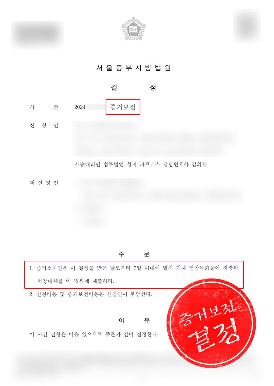 법원은 신청인의 청구 내용을 인용해 대리인이 명시한 영상 녹화물이 저장된 저장매체를 법원에 제출하라 주문했습니다.