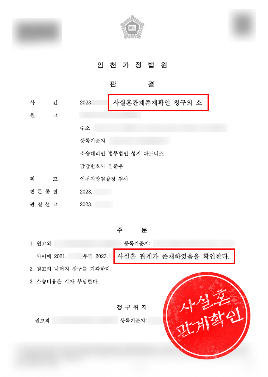 그 결과 가정법원은 원고와 망인의 사실혼 관계가 존재하였음을 확인하였습니다.