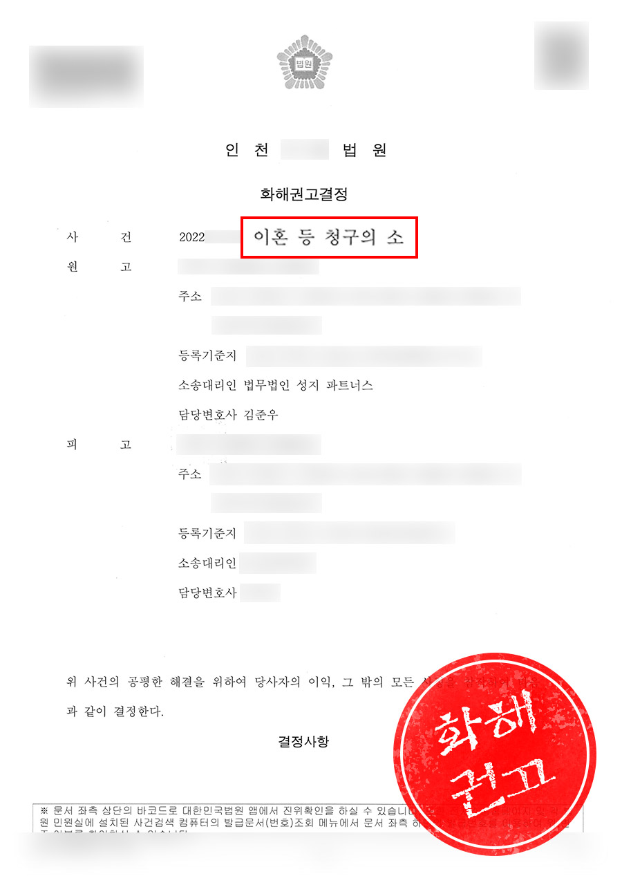 의뢰인은 당시 배우자의 외도 증거로 사진만 확보하였습니다. 그러나 담당 변호사가 조력하여 배우자의 외도를 입증할 수 있는 증거를 더 확보하였습니다. 그 과정에서 배우자가 정신 질환 병력이 있음에도 의뢰인에게 알리지 않고 혼인을 하였다는 사실도 알게 되었습니다. 이에 배우자의 부정 행위와, 배우자의 병력 은폐로 인하여 혼인 관계를 더 이상 유지하기 어려운 상태임을 밝힌 이혼 소장을 법원에 제출하였습니다.