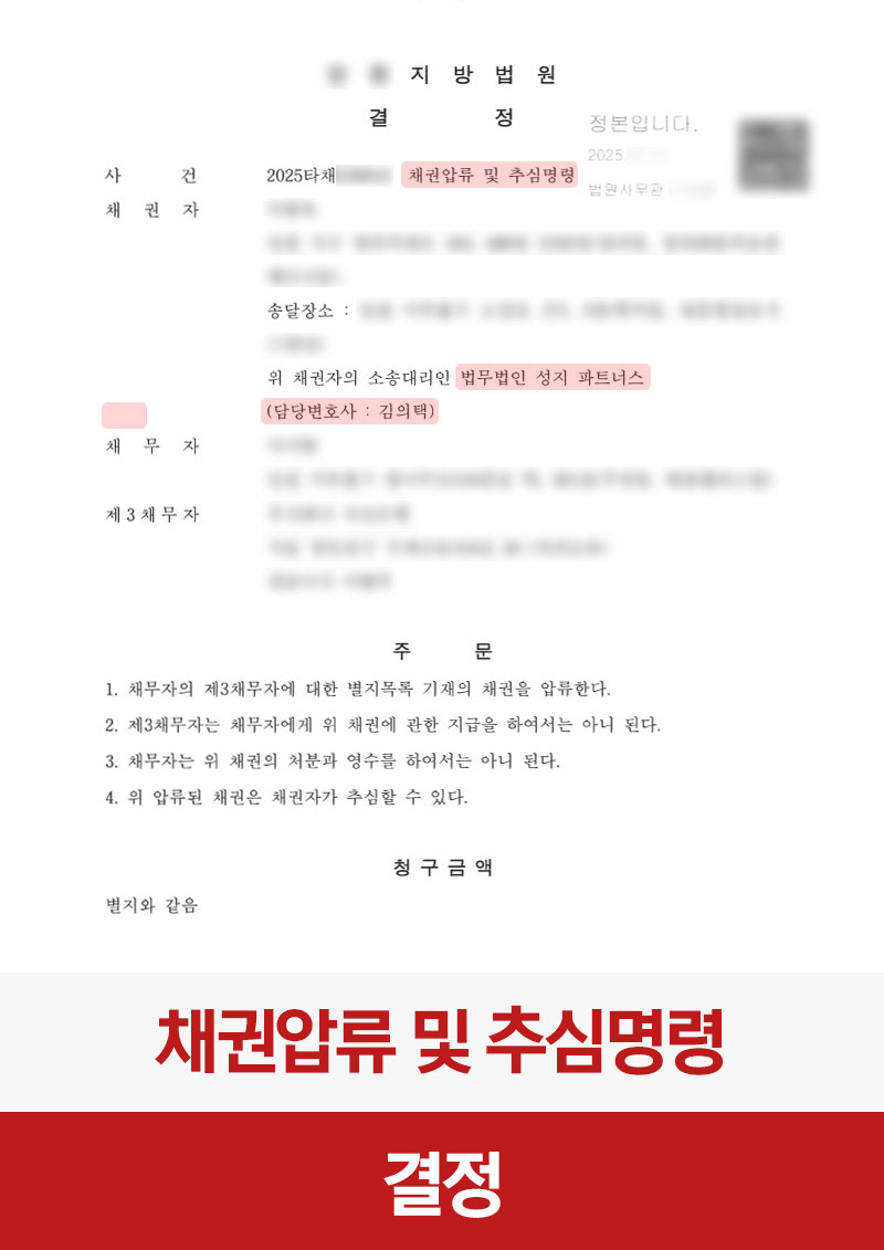 의뢰인은 채권자 대리인으로서 법원에 채권압류 및 추심명령 신청을 진행하였고 동시에 채무자와 제3채무자에게 채권 관련 지급과 처분을 금지하도록 요청하였습니다. 이를 위해 채권의 존재와 범위를 명확히 하고 압류된 채권이 채권자의 권리에 따라 추심될 수 있도록 법적 절차를 체계적으로 준비하였습니다.